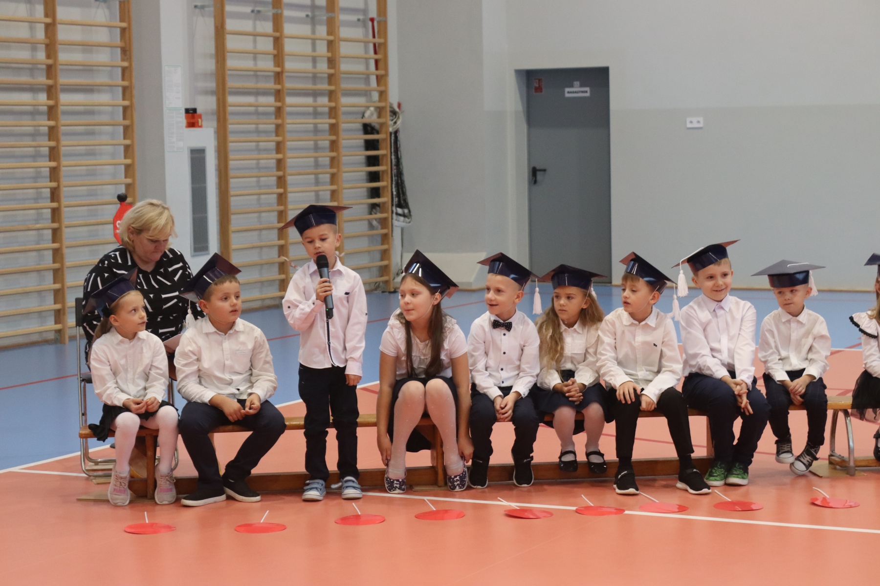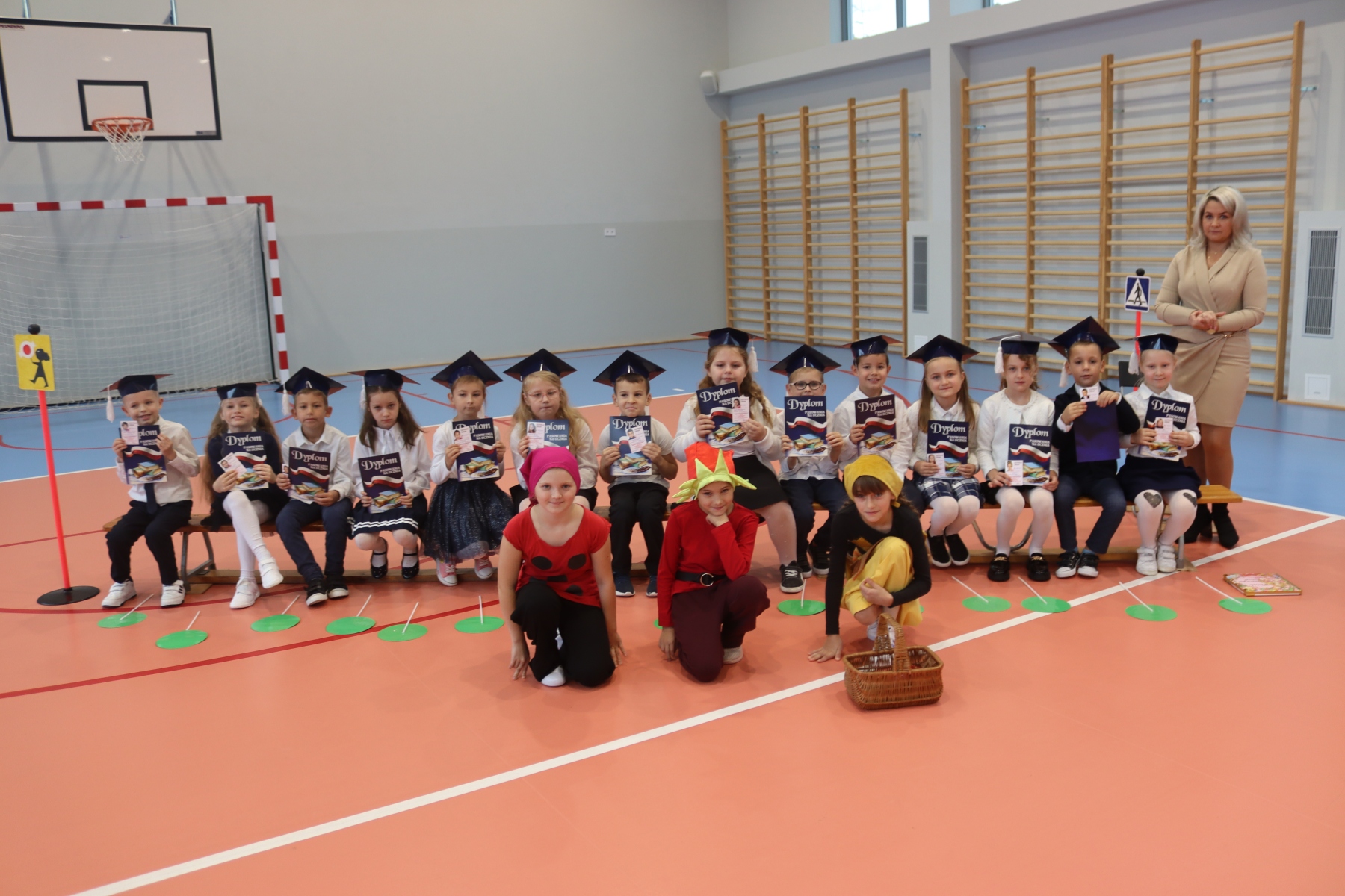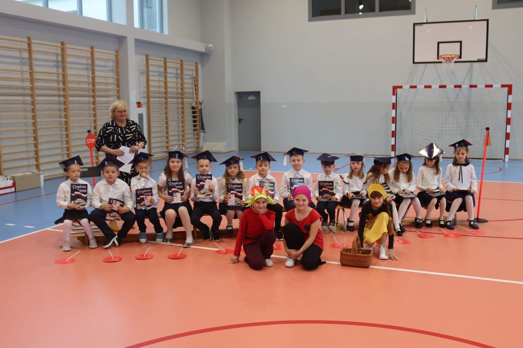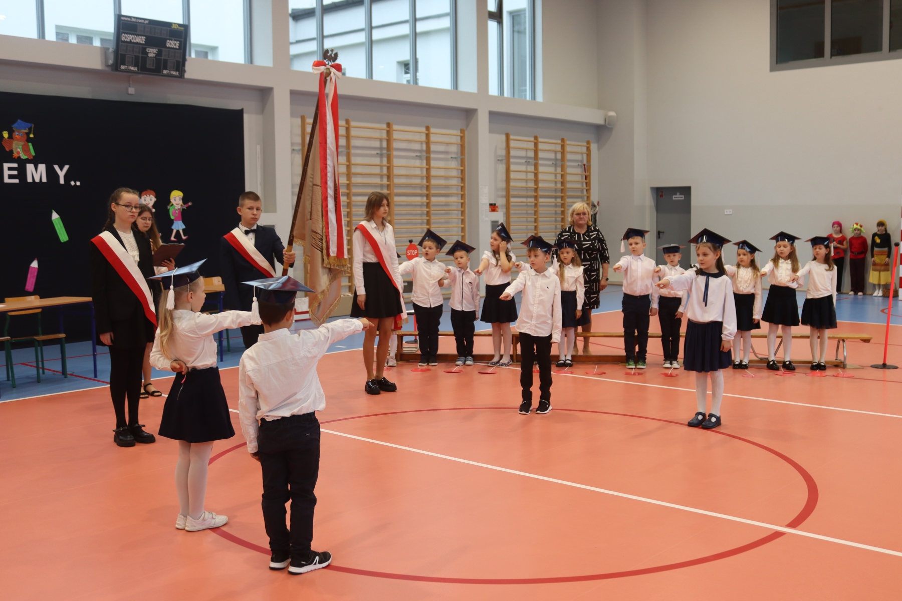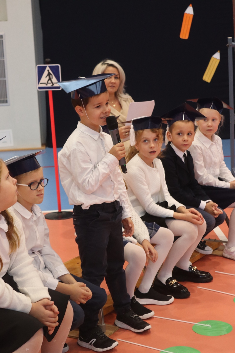 Dnia 13.10.2023 uczniowie klasy I A i I B pojawili się w szkole w pięknych strojach galowych i granatowych biretach na głowach. Wyglądali bardzo dostojnie. Pod okiem wychowawczyń pani Ani i pani Ewelinki przygotowali ciekawy, wesoły i rozśpiewany program artystyczny. Na wstępie pierwszaków powitała Sierotka Marysia i krasnoludki: Koszałek i Biedronek. W te role wspaniale wcieliły się uczennice klasy IV – Zosia Pałac, Ania Krupnik i Zuzia Pachel.