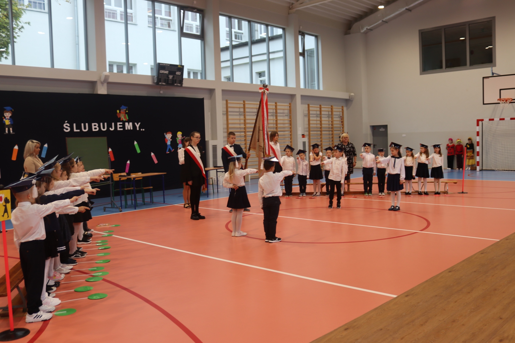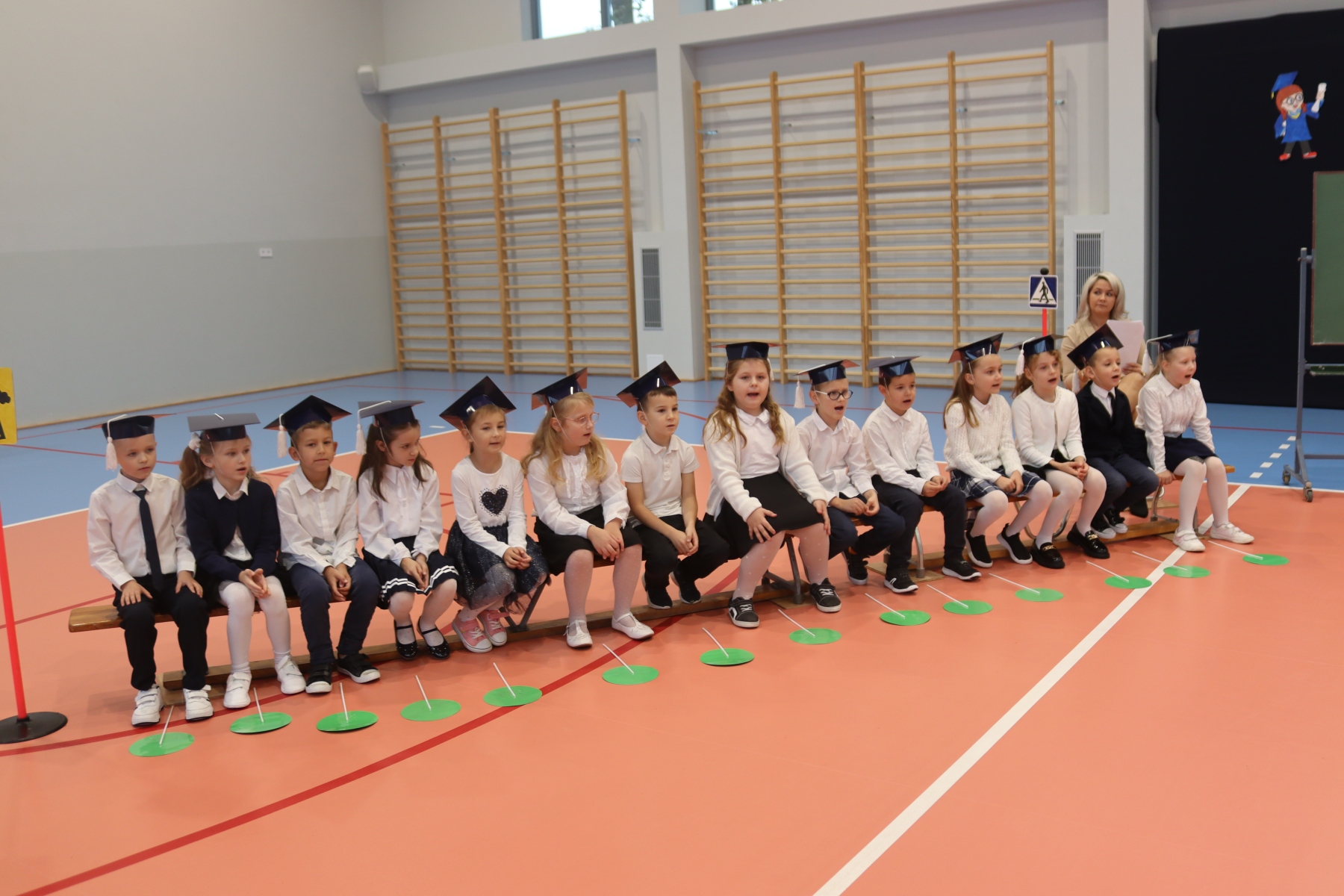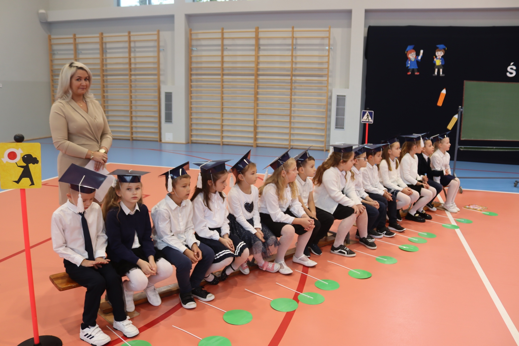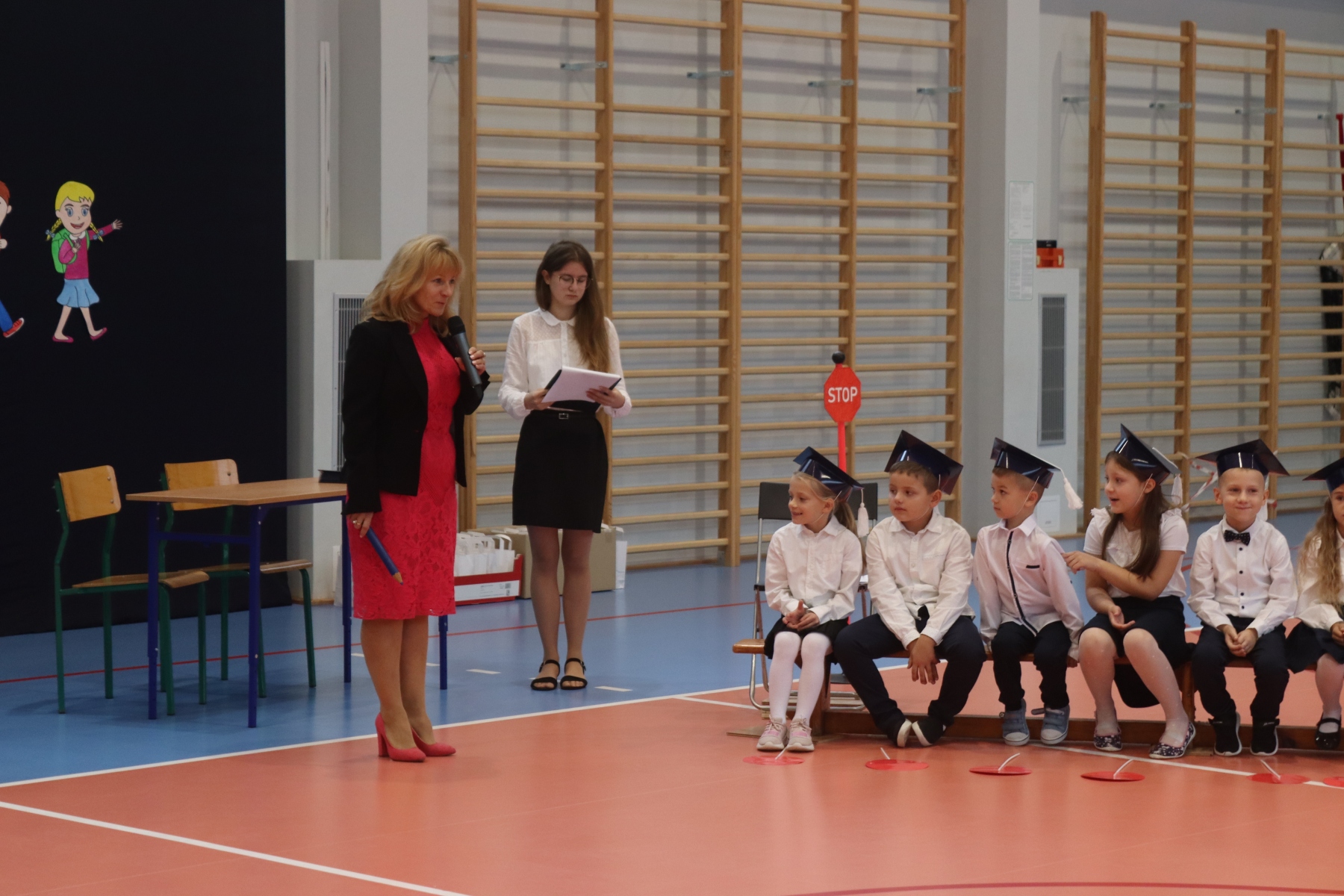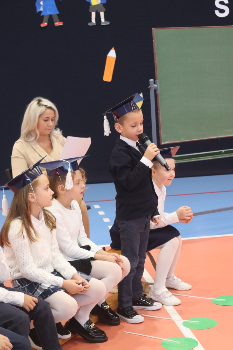 Dnia 13.10.2023 uczniowie klasy I A i I B pojawili się w szkole w pięknych strojach galowych i granatowych biretach na głowach. Wyglądali bardzo dostojnie. Pod okiem wychowawczyń pani Ani i pani Ewelinki przygotowali ciekawy, wesoły i rozśpiewany program artystyczny. Na wstępie pierwszaków powitała Sierotka Marysia i krasnoludki: Koszałek i Biedronek. W te role wspaniale wcieliły się uczennice klasy IV – Zosia Pałac, Ania Krupnik i Zuzia Pachel.