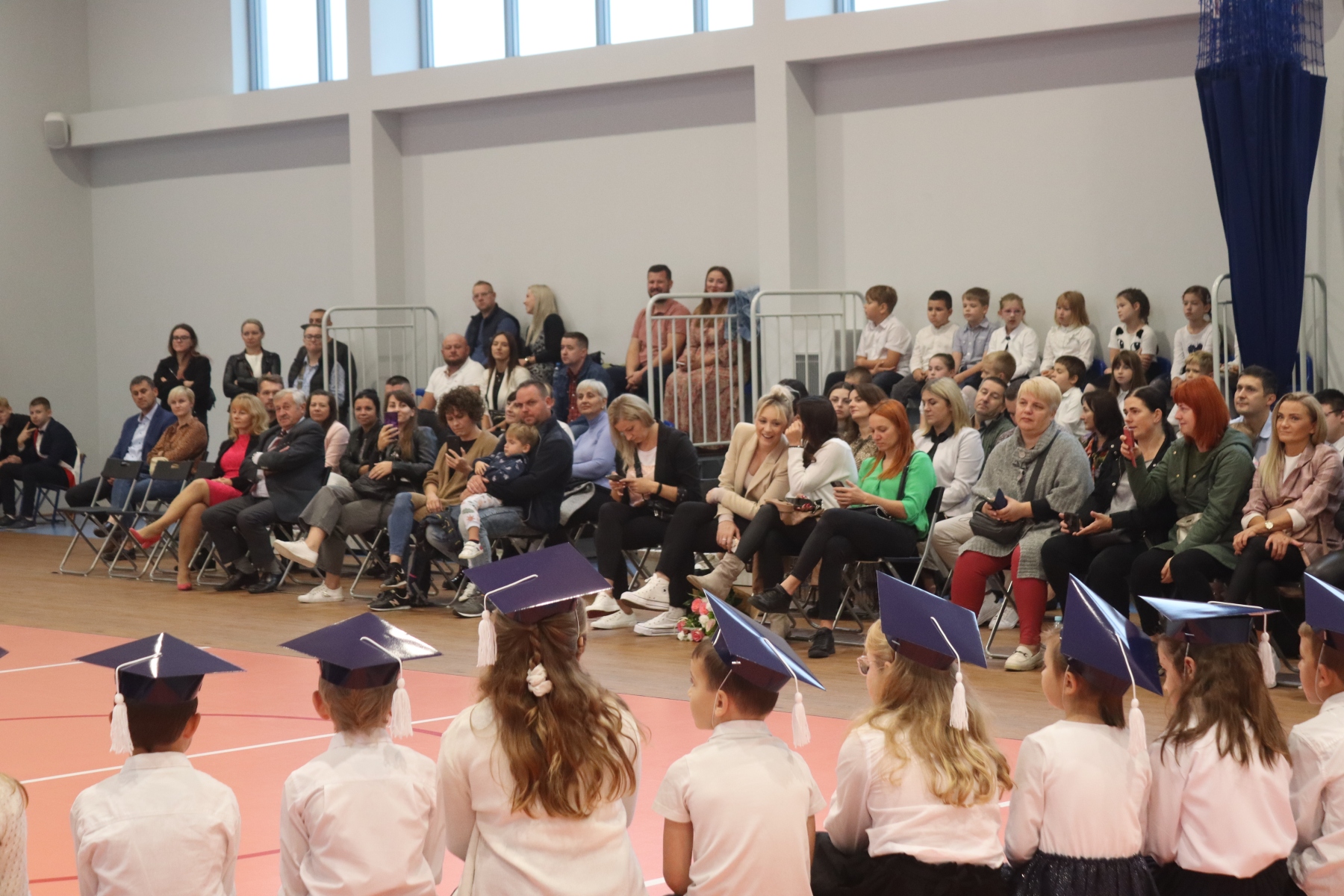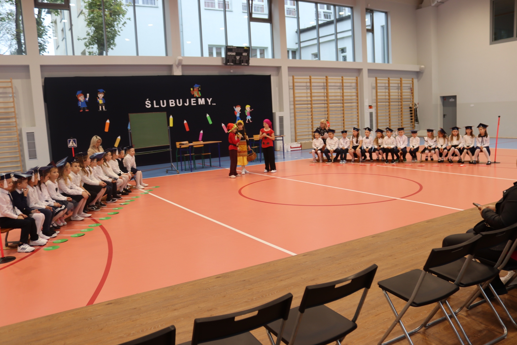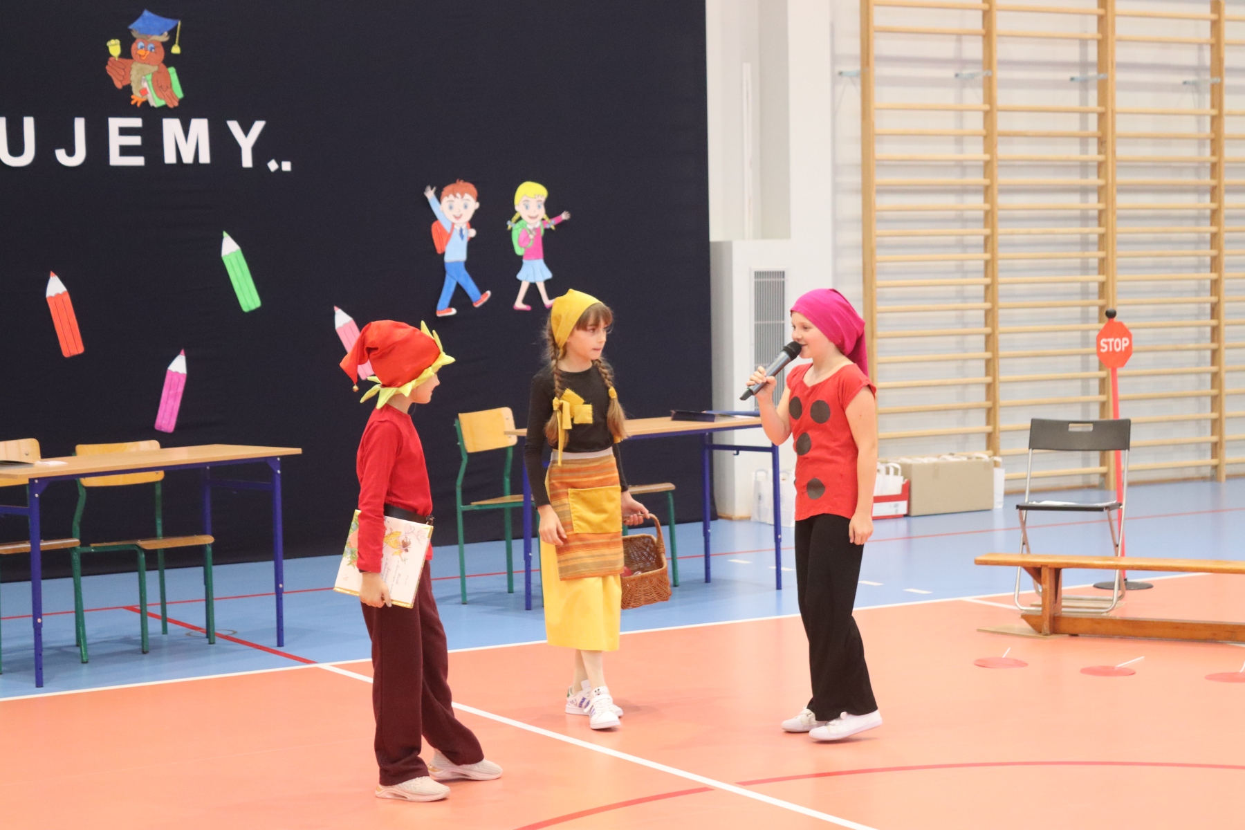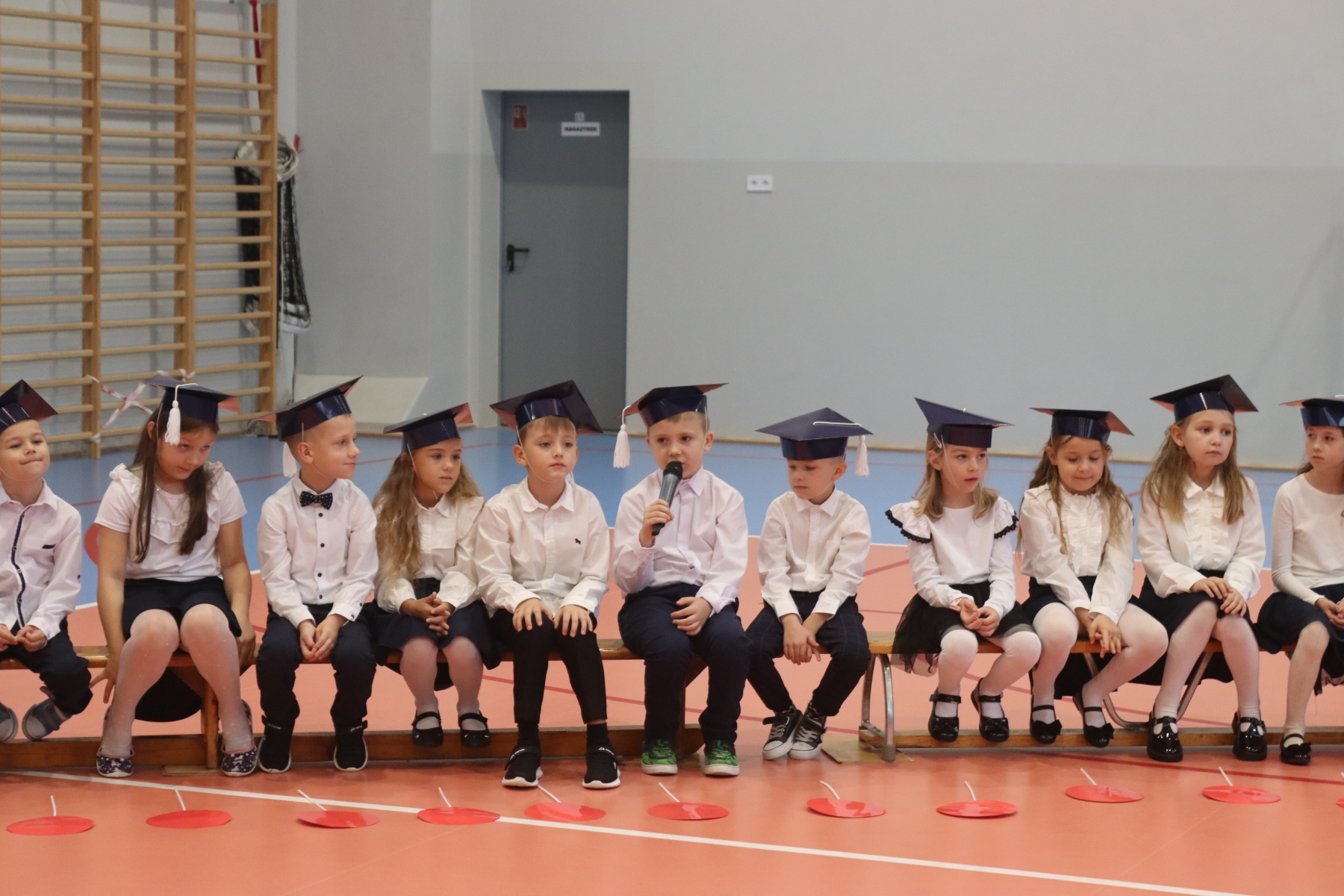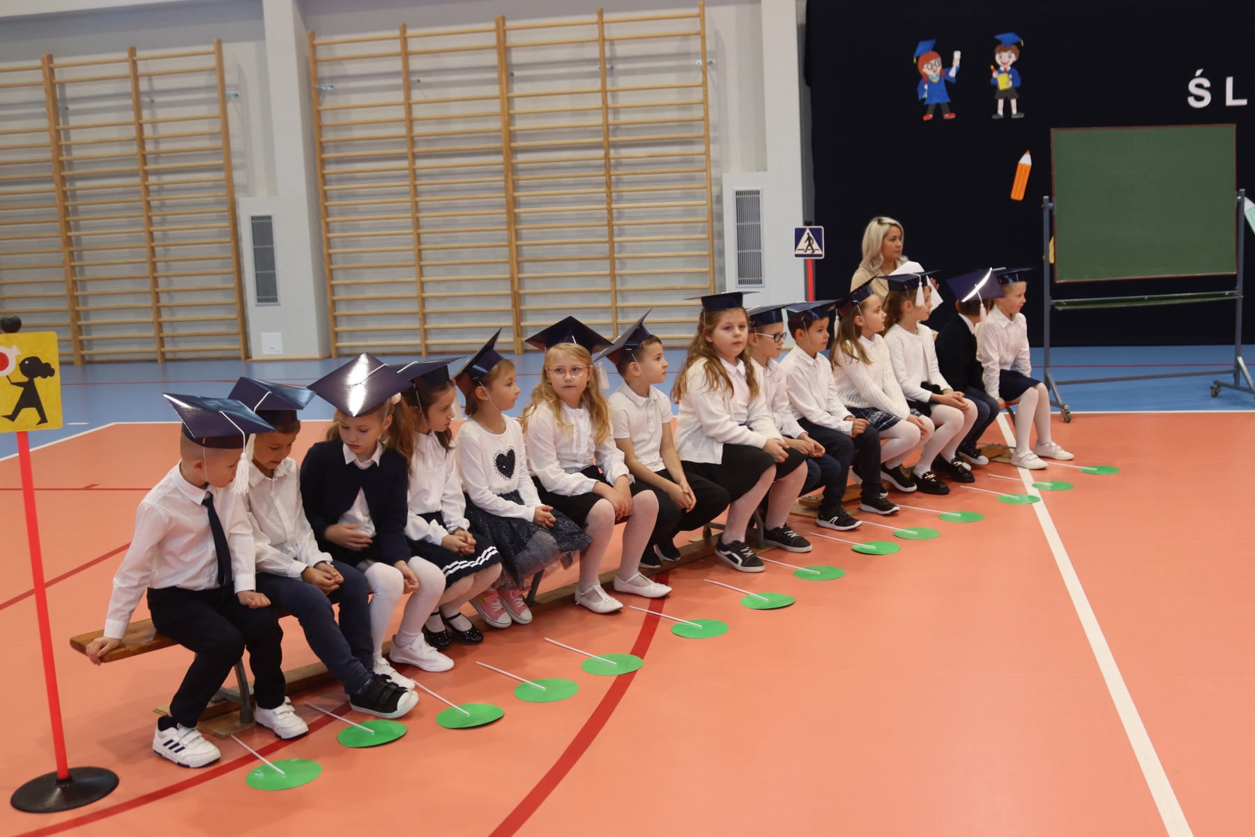 Dnia 13.10.2023 uczniowie klasy I A i I B pojawili się w szkole w pięknych strojach galowych i granatowych biretach na głowach. Wyglądali bardzo dostojnie. Pod okiem wychowawczyń pani Ani i pani Ewelinki przygotowali ciekawy, wesoły i rozśpiewany program artystyczny. Na wstępie pierwszaków powitała Sierotka Marysia i krasnoludki: Koszałek i Biedronek. W te role wspaniale wcieliły się uczennice klasy IV – Zosia Pałac, Ania Krupnik i Zuzia Pachel.